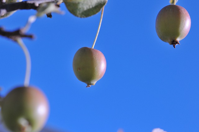 庭の姫林檎の木に少し赤く色づき始めた実がなっています。